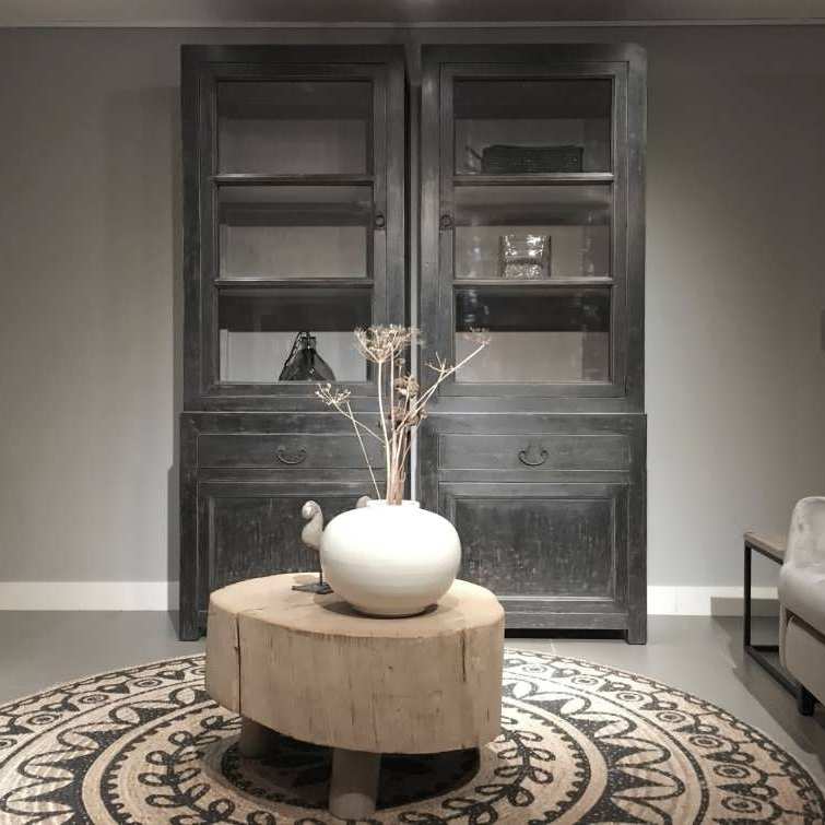 Smalle zwarte vitrinekast gemaakt van oud hout. Gemaakt van authentiek hout met karakteristieke details, elk meubel is uniek en heeft zijn eigen karakter.